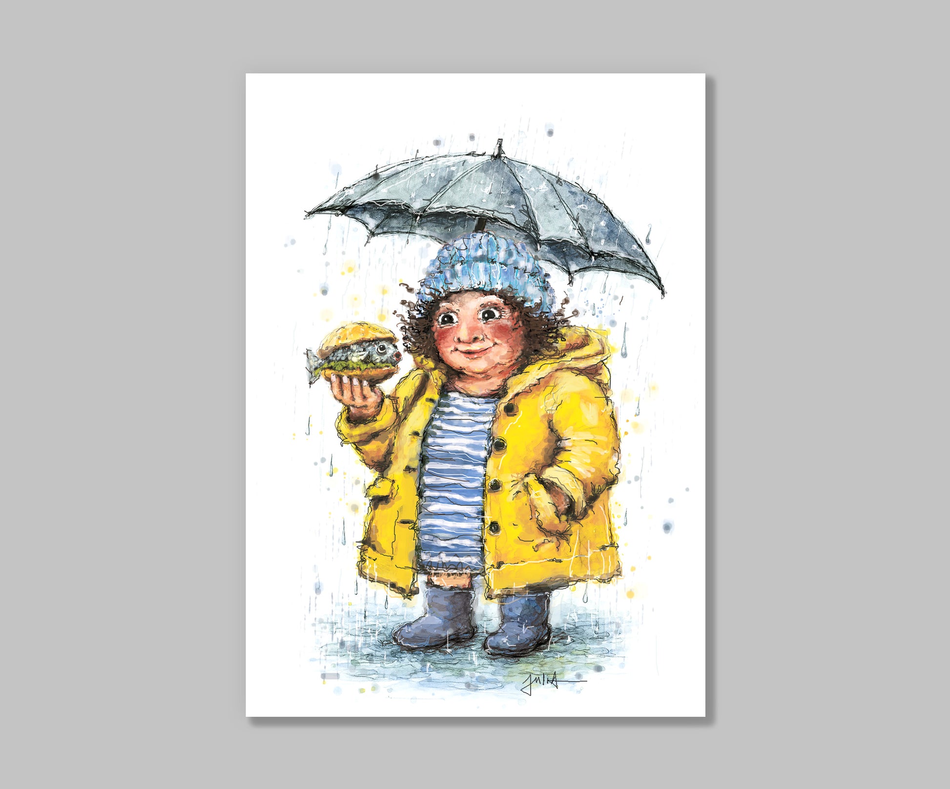 Postkarte Fischbrötchen im Regen | Hamburgerin handgezeichnet A6 Druck | Maritime Kunst mit nordischem Witz