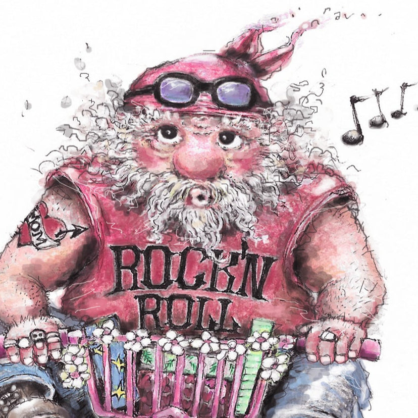Diese Postkarte zeigt einen bärtigen Biker, der mit Sonnenbrille, Tattoos, Rock’n’Roll-Shirt und ordentlich Fahrtwind auf einem viel zu kleinen Fahrrad unterwegs ist. Ein Motiv voller Humor, Charakter und Lebensfreude – ideal für alle, die das Leben nicht ganz so ernst nehmen.