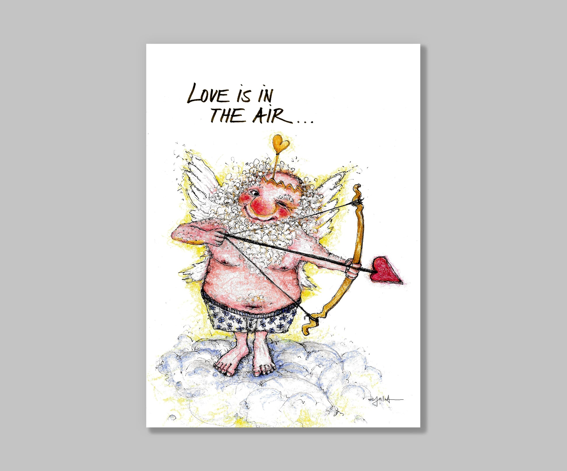 Diese Postkarte zeigt Amur, den kauzigen Liebesgott höchstpersönlich – rosa, lockig, fröhlich und ganz in himmlischer Mission unterwegs. Mit Herzpfeil im Anschlag und einem frechen Grinsen auf den Lippen trifft er garantiert mitten ins Herz. Ein witziges und zugleich liebevolles Motiv für Valentinstag, Hochzeit oder einfach so – weil Liebe immer passt.